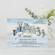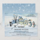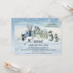 Adult winter birthday party invitation featuring a watercolor painting of a snow covered landscape with cute houses, a black cat and snowmen. On the back is an abstract simple design with snowflakes.