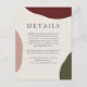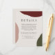 A simple, elegant and artistically styled wedding details card to provide your wedding guests with all the important details surrounding your big day. This design has a rich autumn colour palette with burgundy wine red, terra-cotta and hunter green abstract shapes along the edges of the design. An ecru background blends well with the fall colours. Elegant type face pairings are used to convey your wedding details in beautiful style. Personalise the text template with your desired text.