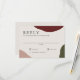 An artistically styled wedding response card that conveys simple elegance, this design has a rich autumn colour palette in burgundy wine red, terra-cotta and hunter green abstract shapes along the edges of the design. An ecru background blends well with the fall colours. The type face is crisp and elegant in its simplicity. Personalise with your required RSVP response date.
