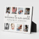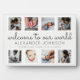 It's time to get those photos off your phone and on display where everyone can enjoy the memories with this modern baby photo collage design. The words in the middle say "welcome to our world" and you can add your baby's name and birth stats.