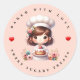 Modern baked with love bakery custom sticker. Cute bakery girl chef holding a delicious strawberry frosted cake.