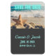 Modern, vertical non-traditional Save the Date announcement features beach scene (that includes waves and starfish in the sand) photography background with Save the Date in aqua blue neon. Personalise with wedding couple's details on dark grey background.