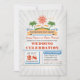 Retro beach scene wedding invitation with palms, blue waves, starfish couple, beach umbrellas, hot sun and two coral love hearts. Perfect wedding invite for summer beach wedding or destination weddings.
