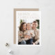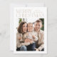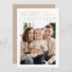 Modern Christmas photo card featuring "Merry Christmas" displayed at the top of the design in trendy light beige lettering with a white background. Personalise the simple Christmas card with your family name and photo. The card reverses to display a light beige background with subtle white dots (snow).