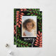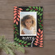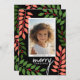 A modern Merry Christmas photo card with botanical leaves and berries - green, white and teal. The modern design includes eucalyptus branches and berries and sans serif type for the main part of the text. The greeting is in a rustic modern script. The back includes a eucalyptus pattern in greens and white.