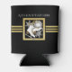 The design features a pair of ice skates over a snowflake crest with black and faux gold glitter background. This elegant winter sports design serves as a cool modern and unique can cooler with personalised text.