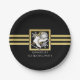 The design features a pair of ice skates over a snowflake crest with black and faux gold glitter background. This elegant winter sports design serves as cool modern and unique paper plates with personalised text for ice skating | figure skating themed birthday, Christmas party, or any other special occasions.