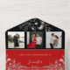 Elegant, modern, vintage, black and red all-in-one wedding invitation with silver rope heart, gilded floral lace and custom four pictures of the couple.
