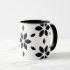 A chic black and white abstract floral print features elegant black flower petal shapes on a crisp white background.