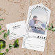 This all-in-one wedding invitation features a modern black and white design with a minimalist touch. The centerpiece of the invitation is a beautiful arch that elegantly frames a faded photo of the couple, evoking a sense of nostalgia and romance. The wedding details are thoughtfully placed on the arch, seamlessly blending with the overall aesthetic. Adding a unique touch, the names of the couple are written in a curved font at the top, following the graceful curve of a line that extends to the right, creating a visually pleasing composition. Additionally, the invitation includes a tear-off RSVP card for convenience.