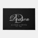 Modern Black And White Established Family Name Doormat is designed with customisable black background and light grey monogram initial on the centre. Personalised with last name in classy white calligraphy script lettering. The year established is in white numbers. His and her first names are on lower front centre. Makes a great housewarming or bridal shower gift idea.