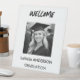 Modern black and white graduation pedestal sign designed to welcome guests with a clean and elegant presentation. Featuring a minimalist layout and bold typography, this sign is ideal for graduation parties, receptions, and entry displays. A stylish décor piece that complements modern and neutral graduation celebrations.
