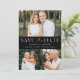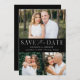 Elegant, multi-photo save the date featuring "Save the Date" displayed in white lettering with a black background. Personalise the modern QR save the date card with 3 of your favourite photos, your names, wedding date, and wedding location. The black and white save the date reverses to display your custom QR code with wedding website and custom text.