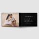 Simple, elegant wedding guest book featuring the couple's names and date displayed in white lettering with the date shown below against a black background. Personalise the spine of the guest book with your names, the date, etc. The back of the modern guest book displays your horizontal engagement photo. The chic black and white wedding guest book is perfect for modern weddings.