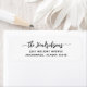 These modern and stylish holiday return address labels feature your family name in black script and text on a simple white background.