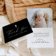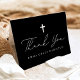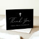 Simple, elegant Baptism thank you card featuring a cross on the front with "Thank You" displayed in a casual white calligraphy script with a black background. Personalise the front of the black and white Baptism thank you card with your child's name. The inside of the folded thank you card displays a horizontal photo with your message shown below. This design works great for boy or girl Baptisms.