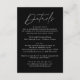 Simple and elegant wedding details card featuring a handwritten white script mixed with modern lettering against a black background. Personalise the minimalist wedding details card with your wedding details such as reception information, hotel accommodations, wedding website, etc. The black and white wedding details card is perfect for modern weddings.