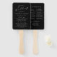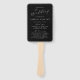 This elegant, modern wedding program fan features white text on a black background. The titles and subtitles appear in beautiful calligraphy script, with the couple's names in serif and the remaining text in sans serif font.