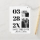 Modern black and white two photo gay Save the Date postcard. It showcases the date in black typography in a column and two photos of the couple. The phrase "Save the Date" is in script style typography. The black features two black tuxedo along with your text.