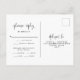 These modern, simple and elegant wedding rsvp response postcards feature a minimalist black and white text design with stylish handwritten script. There is room to add your guests options for meal choice of entrée or dinner choice. Text is kept away from the top and bottom edges of the back of the postcard, to lessen the chance of it being covered on the top and bottom by postal markings.
