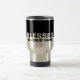 Modern black BLESSED In Jesus' Name Christian travel mug, with the word BLESSED in WHITE typography and IN JESUS' NAME in BLACK. All text is CUSTOMIZABLE, so you can create your own text and add your favourite Scripture reference. This inspirational Christian mug would make a great gift for Christmas, Birthdays, Mother's Day, Father's Day, etc. Other colours (incl glitter versions) are available.