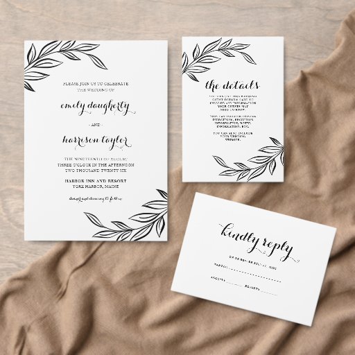Chic and modern black and white wedding invitation features simple illustrated black botanical leaves and pretty calligraphy script. Shop this beautiful wedding collection for the coordinating wedding suite.