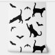 Simple black silhouette pattern of cat and bat silhouettes. One cat is stretching, another is just standing while a third one is reaching towards a flying bat. This design has a modern Halloween aesthetic for those who enjoy a minimal and stylish seasonal look.
