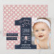 A Modern first birthday party invitation for a girl with pink dots and chalkboard one