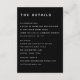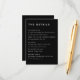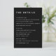 The Aesthetic: Provide your guests with essential information in a high-impact "Noir" style with this modern black and white enclosure card. This "information hub" utilises a bold, architectural layout and our signature white Dongle typography to organise your wedding specifics into clean, sophisticated blocks. The deep black background acts as a gallery-style canvas, ensuring your details are as beautiful as they are functional. Industrial Clarity & Design: This card is engineered for maximum organisation. We’ve pre-set the information into three distinct sections: Accommodations, Reception, and Wedding Website. To maintain the "industrial-chic" hierarchy, we recommend entering your details in all caps for the first two sections; then, use lowercase for your wedding website to create a visual contrast that helps the URL stand out. The Branded Monogram: This fully customisable template features a sophisticated white "L & G" couple's monogram on the back, serving as a striking "noir" signature for your suite. This designer touch ensures your stationery looks cohesive and high-end from every angle. Personalisation & Quality: Easily update each block while maintaining the perfectly balanced editorial grid. For the best result, I highly recommend our Matte paper stock for a deep, velvety black finish—its tactile feel is the perfect match for the "Signature Palette" aesthetic. A Designer’s Pro-Tip: This enclosure card is designed to sit perfectly behind your invitation and RSVP card. By keeping your secondary details on this dedicated black card, you create a striking "layered" look that keeps your main invitation suite feeling like a clean, minimalist work of art.
