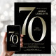 Invite your friends and loved ones with this modern black and gold 70th birthday party invitation. The customisable text area in this invitation template allows you to effortlessly include all the necessary details for your special birthday celebration, including the date, time, venue, and RSVP information. A variety of paper types and corner styles are available for your unique invitations, along with the option to download if you prefer a digital format.