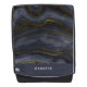 A personalised backpack with a beautiful image of dark abstract agate stone. Colours swirl in waves. Main colours are black, blue-grey with a faux-gold ribbon running through the design. Modern and trendy.