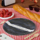 Paper plates with a beautiful image of dark abstract agate stone. Colours swirl in waves. Main colours are black, blue-grey with a faux-gold ribbon running through the design. Modern and trendy.