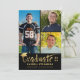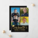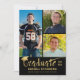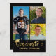 Modern graduation announcement featuring a hand-lettered brushstroke GRADUATE title in gold accented with a faux metallic gold foil graduation cap and class year with a total of 4 pictures (a photo collage of 3 on the front and 1 on the back) in your choice of background colour (shown in black). The back side offers an optional text field for information about your graduate (achievements and/or future plans). ASSISTANCE: For help with design modification or personalisation, colour change, transferring the design to another product or if you would like coordinating items, contact the designer BEFORE ORDERING via the Zazzle Chat MESSAGE tab or email makeitaboutyoustore@gmail.com.
