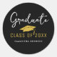 Celebrate your graduate in style with this modern black and gold graduation sticker, featuring an elegant script "Graduate," a sleek graduation cap illustration, and customisable text for the graduate's name, school, and class year. Perfect for sealing invitations, decorating favours, or adding a personalised touch to party decor. A chic and timeless design for any high school or college graduation celebration.