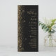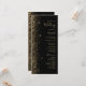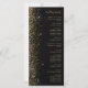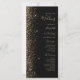 The left-hand edge of this elegant modern wedding program features a gold faux glitter design. The customisable text combines pale gold coloured handwriting, copperplate and italic fonts on a black background.