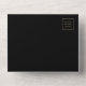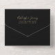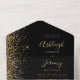 The left-hand edge of this elegant modern all-in-one wedding invitation and RSVP features a gold faux glitter border. The customisable text combines gold-coloured whimsical handwriting, copperplate and italic fonts on a black background. The return address appears on the outside flap and the reverse side of the detachable RSVP card in gold-coloured text on solid black. A QR code is included on the RSVP card for guests who would prefer to reply online.