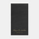These modern personalised wedding paper guest towels feature a hand lettered gold script with yournames and wedding date on a simple black background. Designed by artist Susan Coffey.