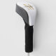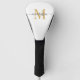 A golfer's golf head cover, featuring a modern monogram with a pale grey initial and a pretty black trendy script signature last name. Do not remove the small square shapes before the name and after the name, as they are the pretty swashes on the ends of the font.