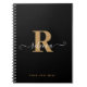 Modern, stylish notebook personalised with a monogram or initials in gold and a name in an elegant, chic handwritten script in white against an editable black background. CHANGES: Change the background colour, choose a style graphic background or change the text font style, colour, size and placement by clicking on CUSTOMIZE FURTHER at the bottom of the PERSONALIZE section. Contact the designer via Zazzle Chat or makeitaboutyoustore@gmail.com if you'd like this design modified or on another product.