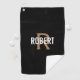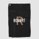 Modern golf towel for him with a gold monogram and white name on a black background. Personalise with name and initial.
