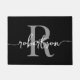 Girly Modern Elegant Stylish Black and Grey Monogram Initial Family Name Script Custom Personalised Doormat. This design featuring a family name in a pretty hand lettered swash tail font calligraphy (or typography) with monogram initial in grey and white on black. Great stylish feminine housewarming gift, also for birthday, wedding, bridal shower, newlyweds, anniversary, bachelorette party and It’s for the girl wholikes clean minimalist things.