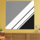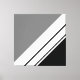 This modern, sleek design features three right corner white different width, diagonal parallel stripes against vibrant black and grey backgrounds.