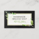 These black and beige business cards for soap, soy wax melts and candles are modern in theme. The design features a chalkboard background with a beige and white text frame with leaves in between.