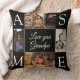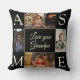 Modern black minimalist 4 photo collage template personalised throw pillow for grandparents. Add your favourite four grandchildren photos with editable text "Love You (Grandma/Grandpa/Dad/Mum/Nanny/Papa/Granny/Grampy/Other)" in modern calligraphy script and 4 name initial monograms. If you need help with the customisation of this design please message me for guidance. Credit: Photo by Christian Bowen on Unsplash