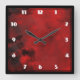 A square clock with a modern abstract pattern. Red and black colours swirl, mix and mingle together. Creative, artistic and unique with a dark, mysterious flair.