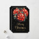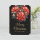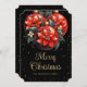 Elegant black and gold Christmas card featuring red floral Christmas ornaments against a starry background.