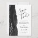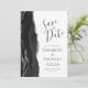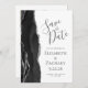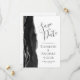 The left-hand edge of this elegant modern wedding save the date card features a black watercolor agate border trimmed with faux silver glitter. The customisable text combines charcoal grey handwriting, copperplate and italic fonts on a white background. The reverse side provides spaces for 5 photos (3 horizontal 1 square and 1 vertical) and room for your wedding website URL or other brief message.