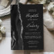 The left-hand edge of this elegant modern wedding invitation features a black watercolor agate border trimmed with faux silver glitter. The customisable text combines handwriting, copperplate and italic fonts in real silver foil on an off-black background. The reverse side features a matching black and silver agate design.