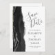 The left-hand edge of this elegant modern wedding save the date card features a black watercolor agate border trimmed with faux silver glitter. The customisable text combines charcoal grey handwriting, copperplate and italic fonts on a white background. On the reverse side, easily replace the sample image with a photo of the future bride and groom, and add one to three lines of additional information such as your wedding website URL.