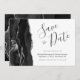 This elegant modern save the date card features a black watercolor agate border trimmed with faux silver glitter. The customisable text combines handwriting script, copperplate and italic fonts in charcoal grey on a white background. The reverse side features a matching black and silver agate design.